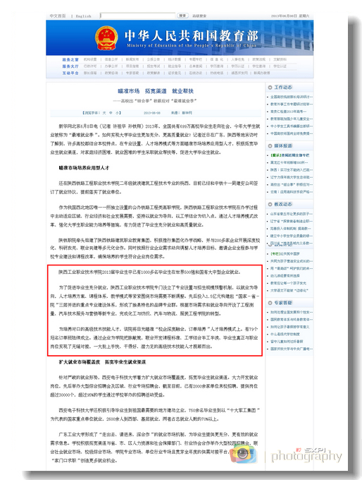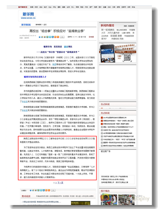 文章说,“陕西工业职业技术学院2013届毕业生中已有1000多名毕业生在世界500强和国有大中型企业就业。为了促进毕业生充分就业,陕西工业职业技术学院专门设立了专业设置与招生规模预警机制,以就业为导向,人才培养方案、课程体系、教学模式等紧紧围绕市场需要不断调整。先后投入1.5亿元构建起“国家-省-院”三层并进的重点专业建设体系,形成了独具特色的品牌专业群。根据市场需求和就业导向开设了工程测量、汽车技术服务与营销等新专业,完成化工与纺织、汽车与物流、服装工程学院的转型。 为培养对口的高级技术技能人才,该院将目光瞄准“校企深度融合,订单培养”人才培养模式上。有79个冠名订单班陆续成立。通过企业为学院把脉献策,联合开发课程标准、工学结合半工半读、毕业生真正与职业岗位实现了无缝对接,一大批上手快、干得好、潜力足的高级技术技能人才脱颖而出。”