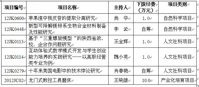 根据陕西省教育厅《关于下达2012年科学研究项目计划(二)及2012年科学研究项目计划(一)经费的通知》(陕教技〔2012〕7号),经专家评审,2012年省教育厅科学研究计划项目已经确定,全省共立项产业化培育项目26项,专项科研项目1112项,其中,人文社会科学类专项478项,自然科学类专项634项,我院共有6项科研项目获准立项,获批准经费共计13万元。