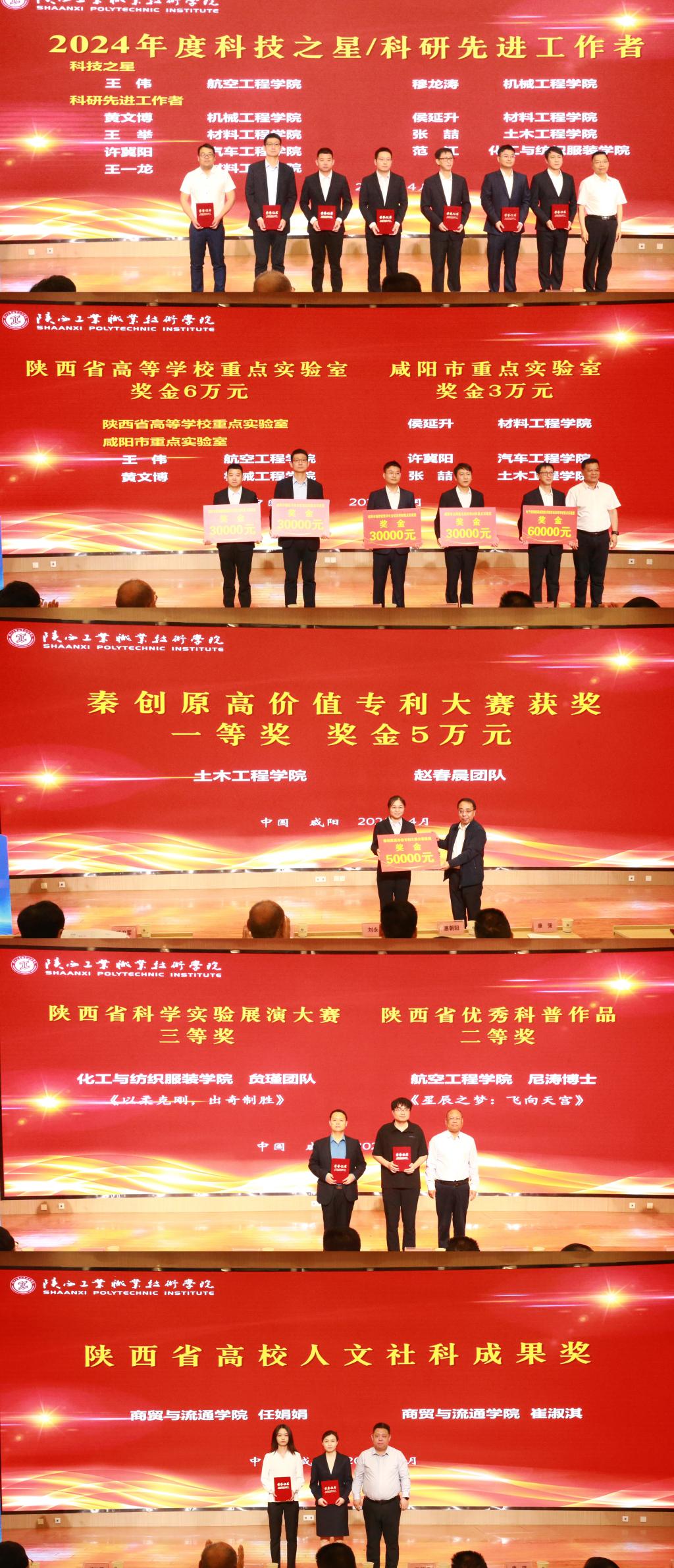 接着,对开云官网2024年度科技之星和科研先进工作者、获批立项的陕西省高校重点实验室和咸阳市重点实验室负责人、秦创原高价值专利大赛获奖团队、陕西省科学实验展演大赛获奖团队、陕西省优秀科普作品获得者及陕西省高校人文社科成果奖获得者分别进行表彰。