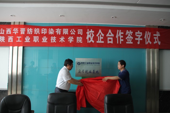 2011年7月17日,我院与山西华晋纺织印染有限公司校企合作协议暨陕西工业职业技术学院就业实习基地揭牌仪式在山西华晋纺织印染有限公司总部进行。院党委书记邓志辉、副院长王晓江、党政办主任朱忠军、继续教育中心主任李元岐、纺织染化学院院长杨建民、服装艺术学院院长康强、电气工程学院院长卢庆林以及山西华晋纺织印染有限公司董事长荆英杰、总经理邓喜荣、副总经理胡会民、龚攀峰、财务总监李婷、各车间生产部门负责人和我院就业学生代表参加了签字及接牌仪式。