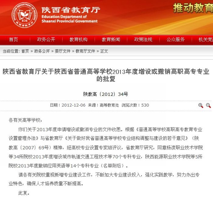 近日,陕西省教育厅印发了《关于陕西省普通高等学校2013年度增设或撤销高职高专专业的批复》(陕教高[2012]34号),批准我院2013年增设“工业设计”专业,至此,我院招生专业已达60个。