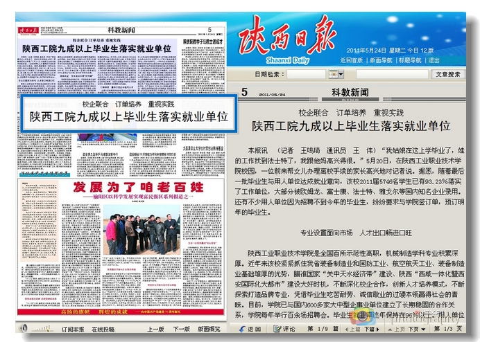 5月24日,《陕西日报》科教版头条报道我院毕业生就业工作,该报道已经被搜狐网、陕西省政府网、和谐陕西网、西部大开发网站等多家媒体争相转载,社会反响较大。