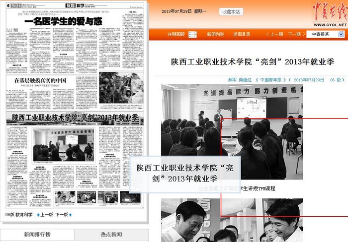 7月29日,《中国青年报》第六版“教育科学”刊发了题为《陕西工业职业技术学院“亮剑”2013年就业季》的文章,该文从“ 全程就业指导,夯实学生就业基础”、“创新课程体系,丰富学生就业内涵”、“ 畅通信息渠道,服...