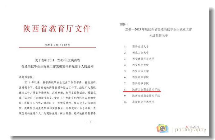 日前,根据陕西省教育厅《关于表彰2011-2013年度陕西省普通高校毕业生就业工作先进集体和先进个人的通知》(陕教生〔2013〕12号)精神,我院再次荣获“陕西省普通高校毕业生就业工作先进集体”荣誉称号。