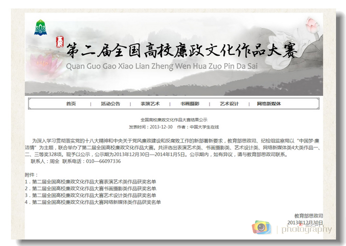 日前,教育部思政司在第二届全国高校廉政文化作品大赛官方网站发布结果公示,代表陕西省参赛的我院演讲作品《父亲的足迹我的路》(侯涛)、小品《爸爸再爱我一次》(付胜利、蒋鹏等)分获表演艺术类全国三等奖。