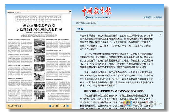 6月11日出版的《中国教育报》以《创办应用技术型高校,示范性高职院校可以大有作为——陕西工业职业技术学院办学纪实》为题,6月27日出版的《中国青年报》以《厚积薄发千帆竞,示范高职育英才——陕西工业职业技术学...