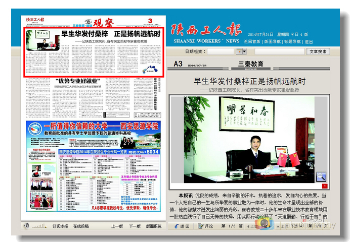 7月24日,《陕西工人报》以《早生华发付桑梓,正是扬帆远航时》为题刊发报道我院院长、陕西省有突出贡献专家崔岩教授的长篇通讯。