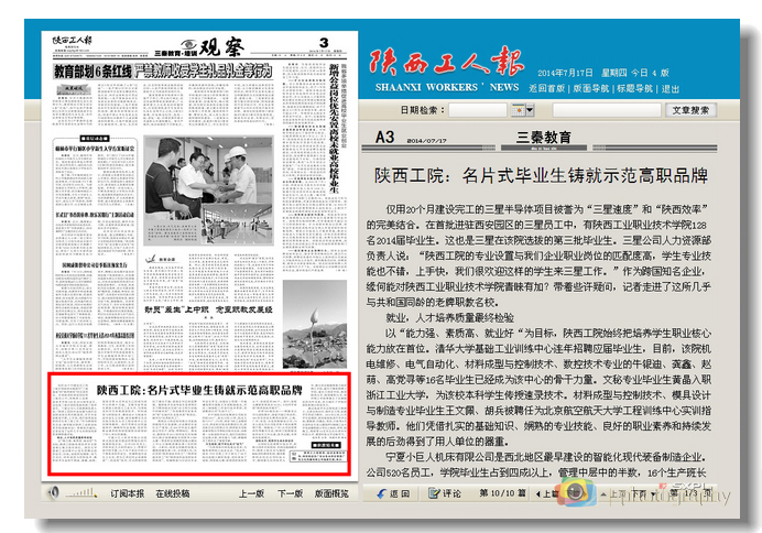 7月17日,陕西省总工会主办的《陕西工人报》以《陕西工院:名片式毕业生铸就示范高职品牌》为题报道我院毕业生就业工作,全文如下: 陕西工院:名片式毕业生铸就示范高职品牌 仅用20个月建设完工的三星半导体项目被...