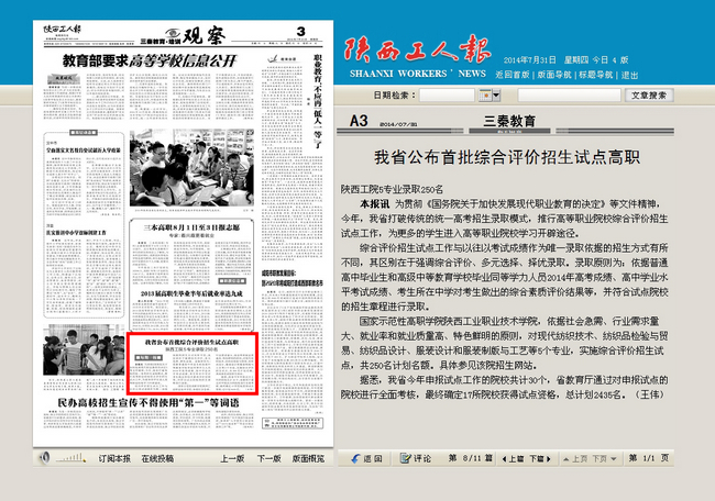 7月31日,《陕西工人报》以《我省公布首批综合评价招生试点高职 陕西工院5专业录取250名》为题刊发新闻。